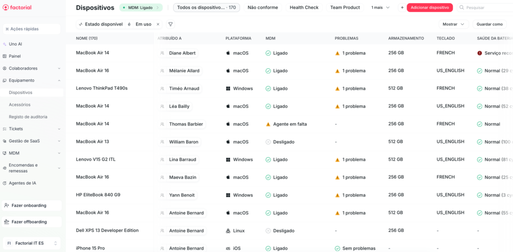 - Inventário e análise de riscos: mantemos um inventário vivo de dispositivos e do seu estado de segurança, mostrando num painel central quem tem cada equipamento e se este está atualizado, encriptado ou se cumpre com os standards. Cada ativo está associado ao seu utilizador e ao seu ciclo de vida, facilitando revisões e auditorias no contexto português.