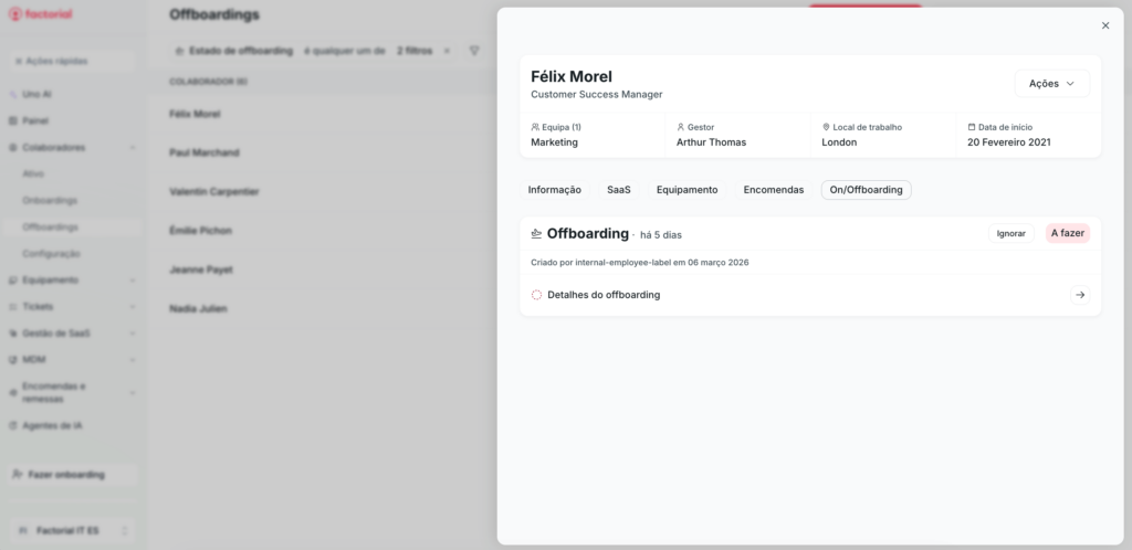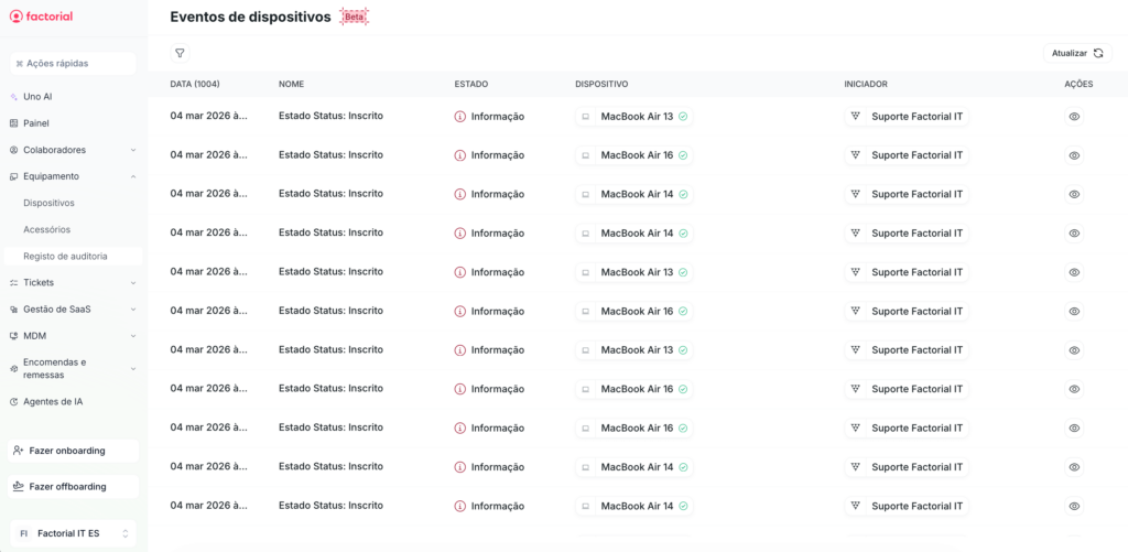 - Controlo de prazos legais sem stress: O Decreto-Lei n.º 125/2025 impõe uma contagem decrescente muito rigorosa para as empresas portuguesas, como o limite de 60 dias para o registo oficial da entidade ou os 20 dias úteis para notificar os responsáveis de segurança junto do CNCS. Com a Factorial IT, tem toda a informação da sua infraestrutura e as evidências de segurança centralizadas num único painel. Isto permite-lhe ter os dados prontos a exportar em segundos, garantindo que cumpre automaticamente e sem constrangimentos os prazos administrativos e as auditorias da autoridade portuguesa.