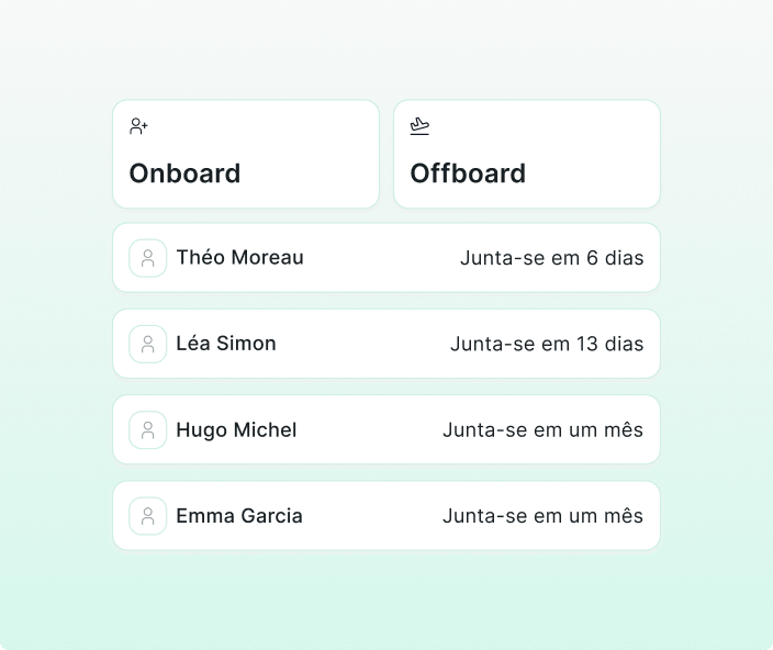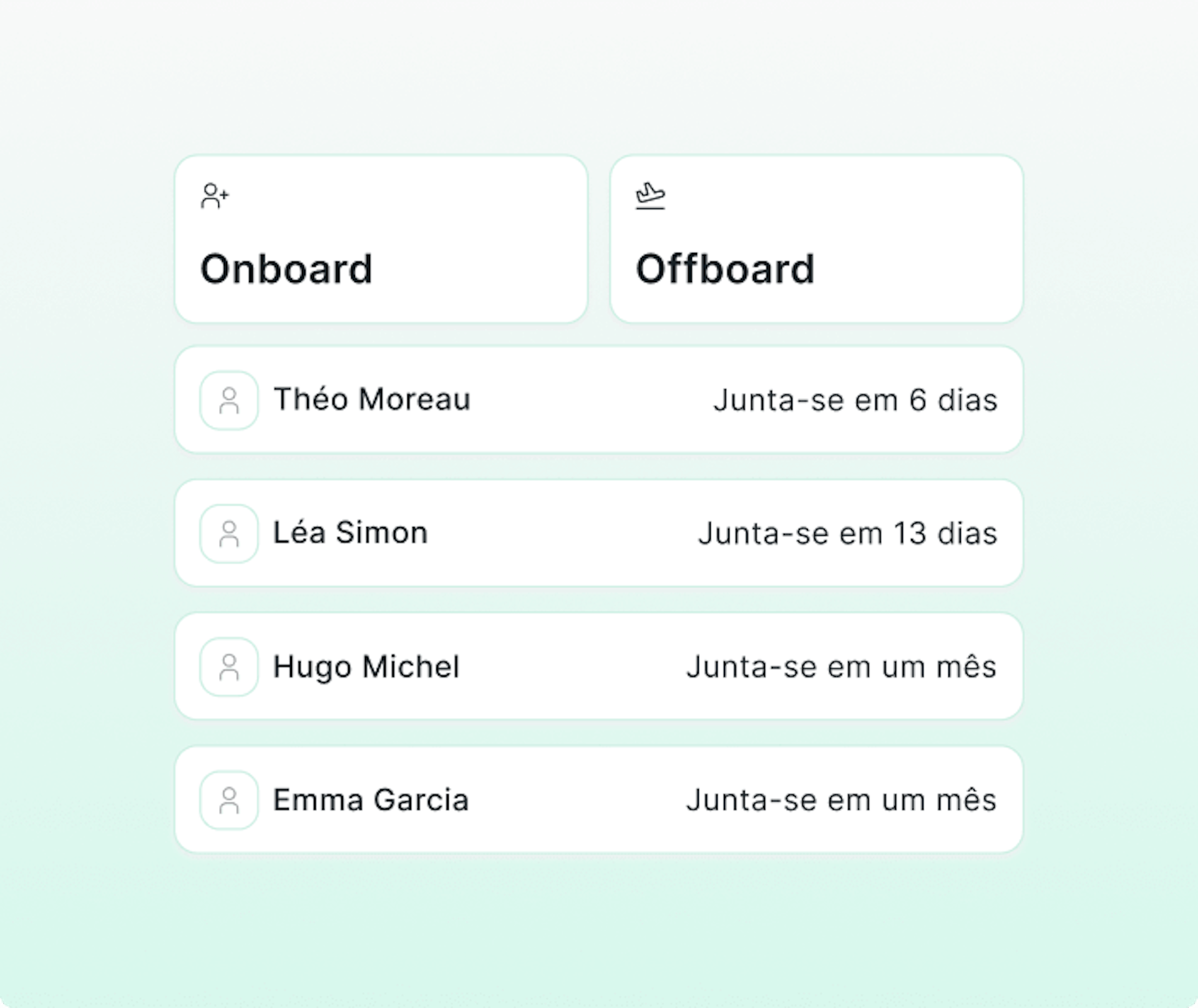 Sem ferramentas separadas por SO. Sem processos manuais. Ligado aos teus dados de RH desde o primeiro dia.