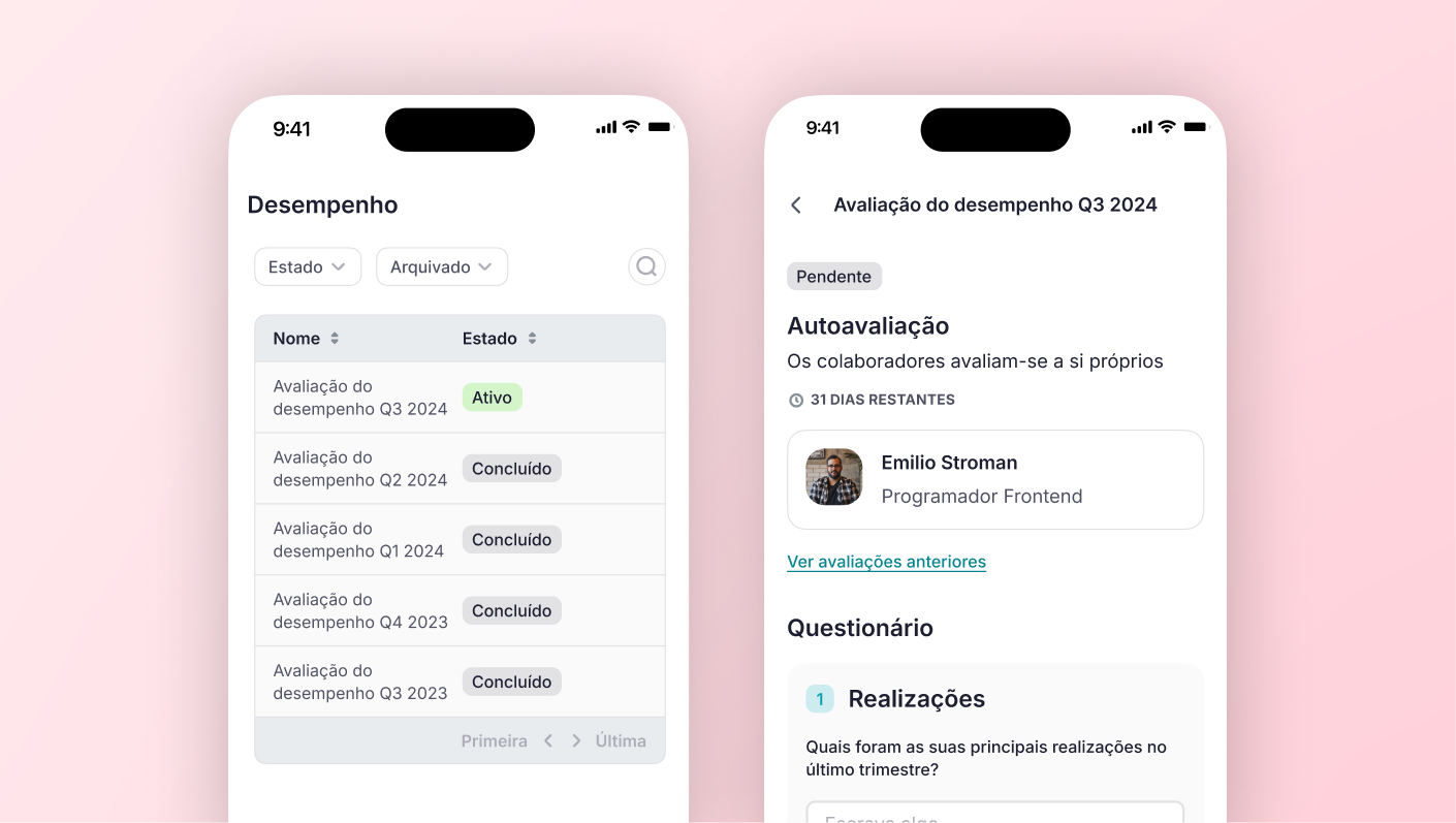 Com a nova secção de Desempenho na app móvel, pode agora concluir avaliações, atualizar planos de ação e consultar feedback anterior — em qualquer momento e em qualquer lugar.