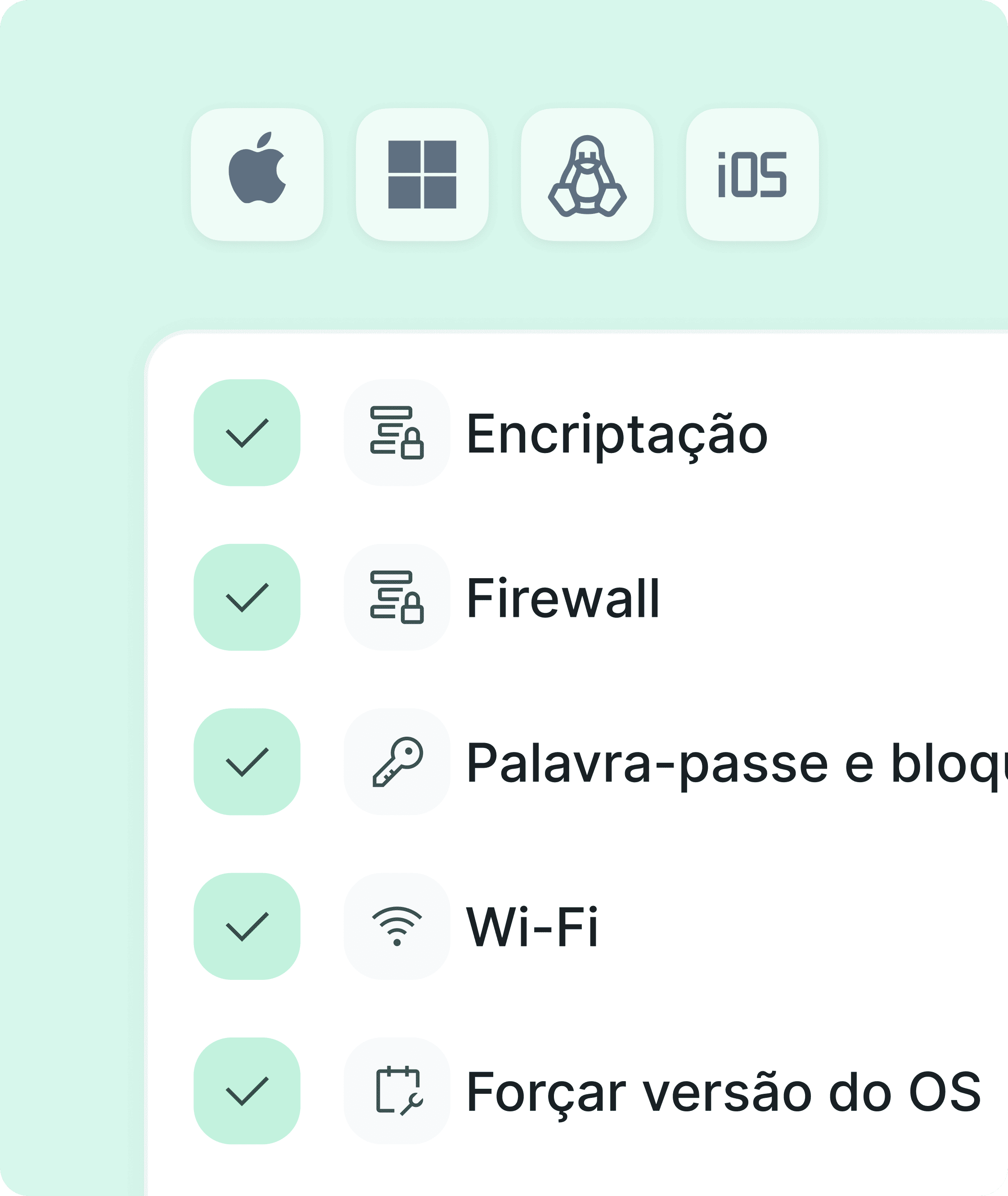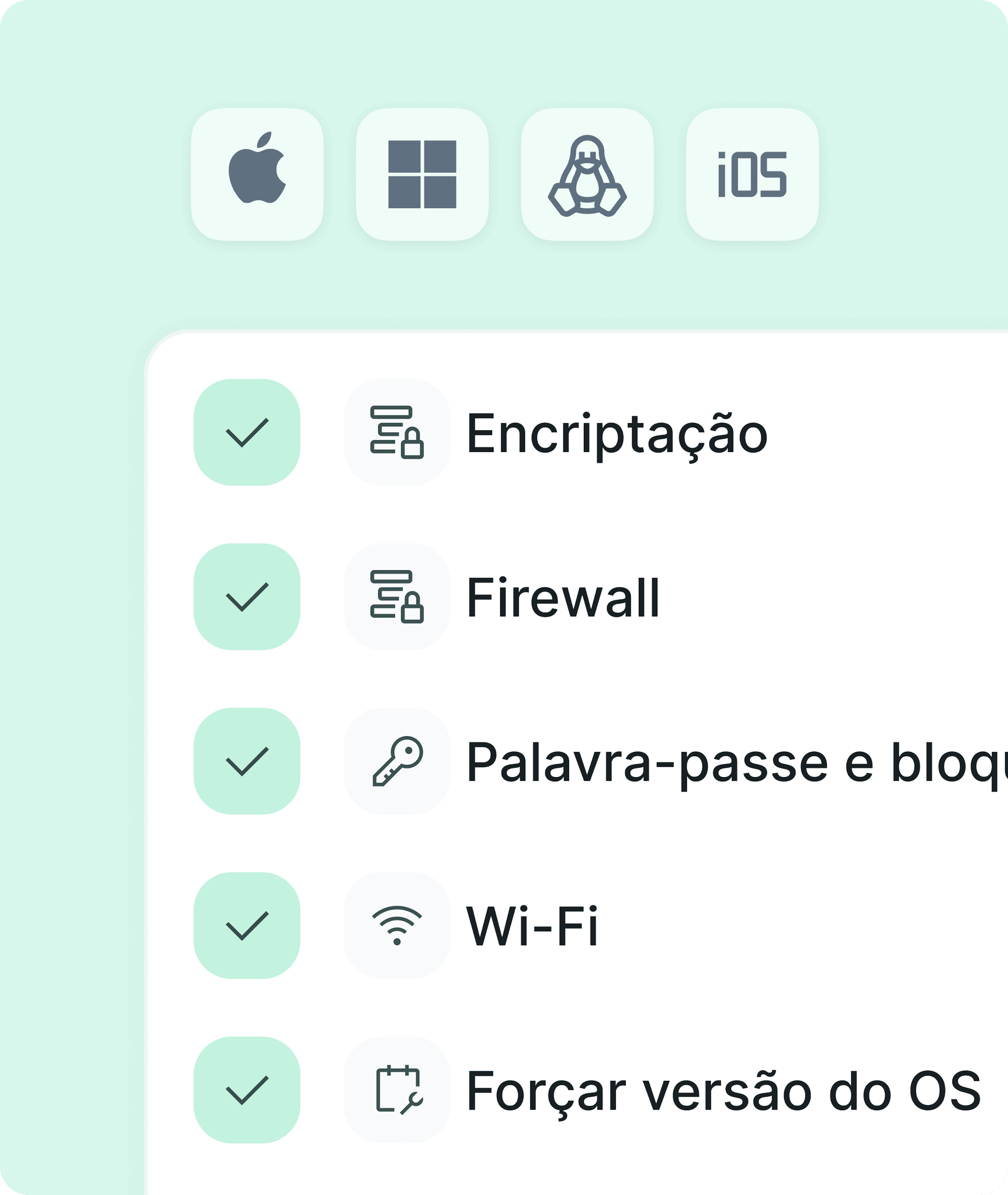 Gerencie Mac, Windows, Linux e iOS a partir de um único painel. Aplique a encriptação, garanta a conformidade com as normas ISO e recupere remotamente os dispositivos perdidos.