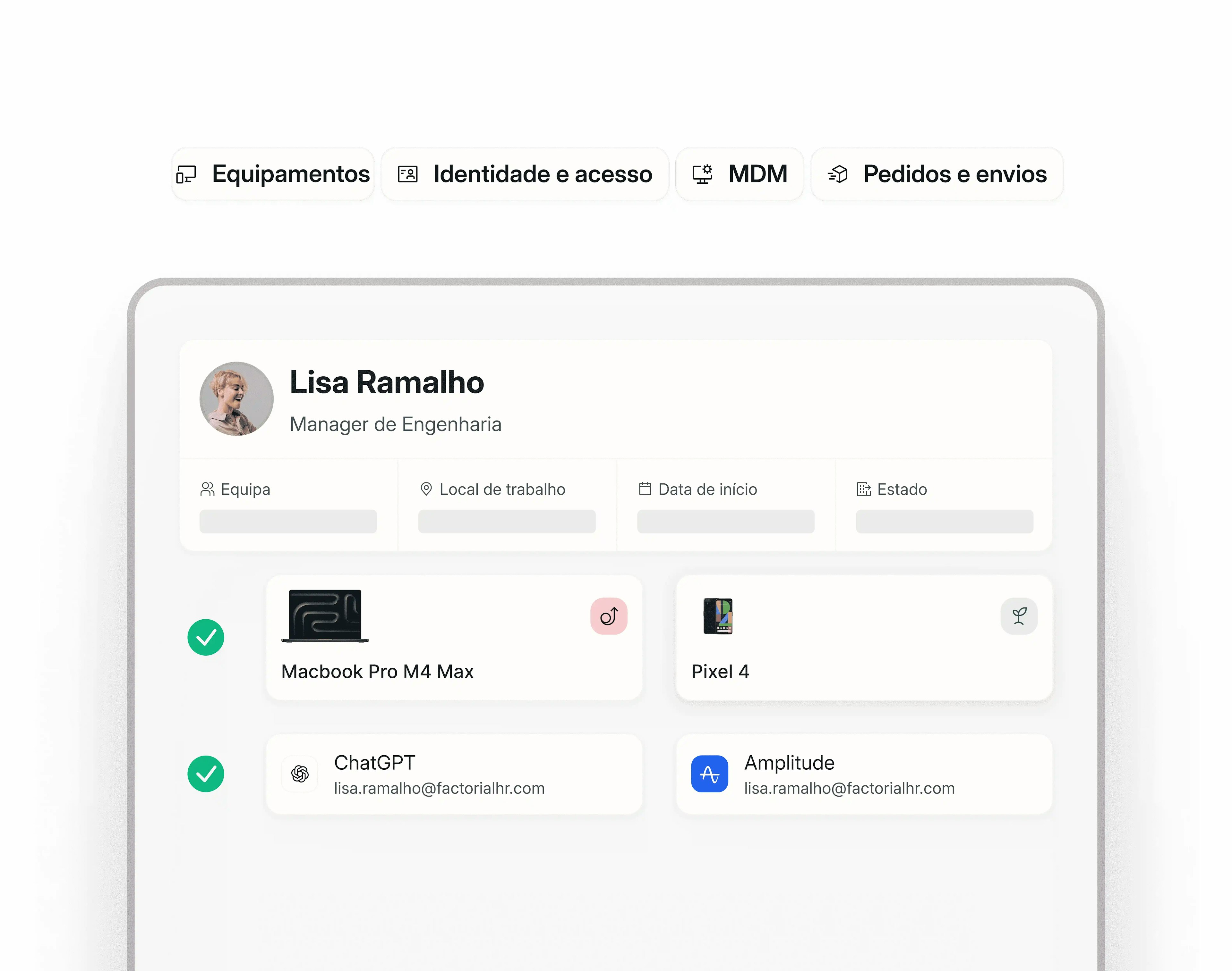 O Factorial IT está ligado ao Factorial HR. As alterações nos dados dos colaboradores ativam automaticamente fluxos de trabalho de IT, como a atribuição de dispositivos, o acesso a SaaS e as atualizações de segurança.